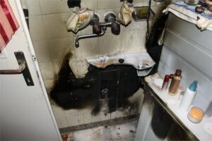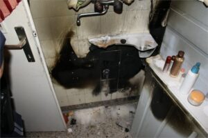 Als die ersten Einsatzkräfte der Feuerwehr Wolfsberg an der Einsatzstelle eintrafen bot sich jedoch folgende Lage: Im Stiegenhaus konnte bereits Brandrauch wahrgenommen werden, die betroffene Wohnung war stark verraucht und sämtliche Rauchwarnmelder hatten Alarm ausgelöst. Zusätzlich stand die gesamte Wohnung mehrere Zentimeter unter Wasser. Um die betroffenen Bereiche rasch wieder rauchfrei zu bekommen wurde beim Stiegenhauszugang ein Druckbelüfter in Stellung gebracht. Anschließend wurde mittels Restlossauger damit begonnen, das teilweise mehrere Zentimeter hoch stehende Wasser aus der Wohnung abzusaugen. Wie die Ermittlungen der anwesenden Polizeibeamten ergaben kam es aus derzeit noch unbekannter Ursache zu einem Brandausbruch im Bereich des Badezimmers. Durch die starke Hitzeentwicklung schmolzen mehrere Armaturen des Waschbeckens und der Waschmaschine wodurch es in weiterer Folge zu einem Wasseraustritt kam der vermutlich wiederrum den Brand löschte. Bereits zum wiederholten Male innerhalb nur weniger Tage konnten bereits installierte Rauchwarnmelder die Bewohner auf das Brandgeschehen aufmerksam machen und somit schlimmeres verhindern.
