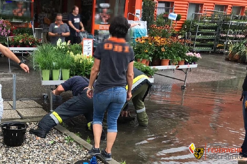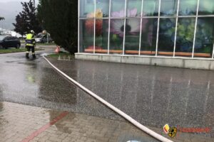 Im Bereich eines Baumarktes kam es durch den starken Regen zu Überflutung im Eingangsbereich. Die Aufgabe der Feuerwehr bestand darin den Kanal mittels Schmutzwasserpumpe vom Wasser zu befreien.